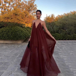 2025新款跨境法式度假风挂脖吊带连衣裙子女夏季气质v领仙女长裙