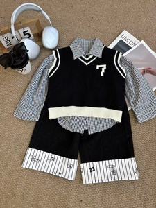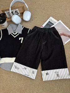 杉伴韩系男小童秋季新款翻边条纹卡通直筒裤男宝宝休闲宽松牛仔裤