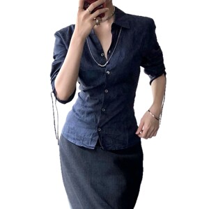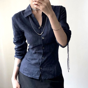 藏青色抽褶中袖收腰版衬衫2025秋季新品气质欧美风开衫单排扣上衣