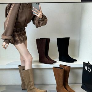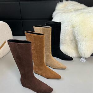 Ali guifei 内增高韩版绒面方头中筒靴2025复古宽筒马丁靴骑士靴
