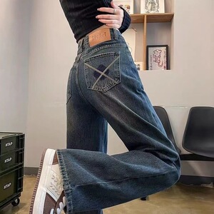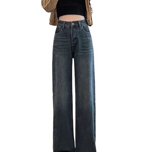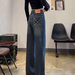复古刺绣阔腿水泥秋冬季加绒牛仔裤高腰显瘦直筒宽松拖地长裤