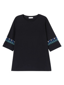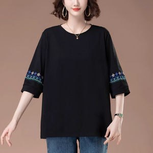 中老年妈妈七分袖上衣女中袖200斤加肥加大码拼接洋气黑色纯棉T恤