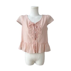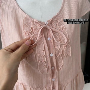 半糖桃酥 粉色设计感花边短袖衬衫女夏蝴蝶结宽松V领上衣