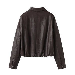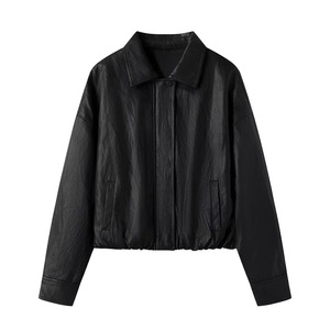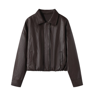 00HL-0023翻领仿皮衣外套2025早秋新款法式风长袖宽松拉链夹克上
