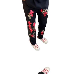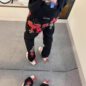 现货CH潮牌裤子限定火焰十字架刺绣直筒做旧水洗明星同款牛仔裤