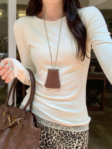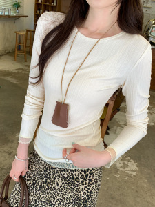 纯欲蕾丝拼接圆领长袖T恤女2025早秋新款修身显瘦打底衫内搭上衣