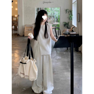 时尚休闲套装女新款秋季慵懒风不规则无袖马甲上衣阔腿裤子两件套