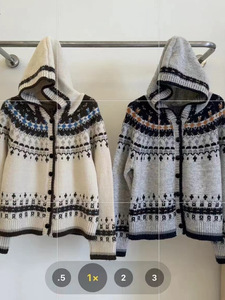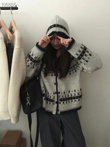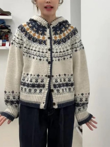 韩系费尔岛复古风撞色提花连帽针织开衫女秋冬新款软糯毛衣外套
