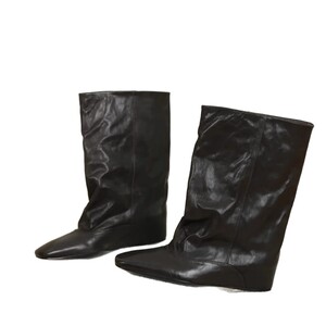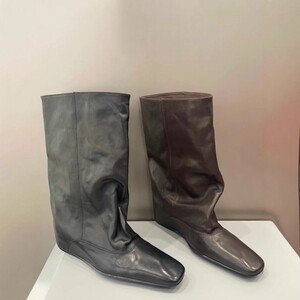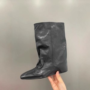 极简风真皮内增高大筒宽版直筒靴女2025新款方头中筒靴显瘦西部靴