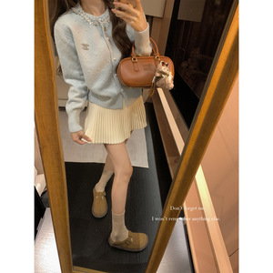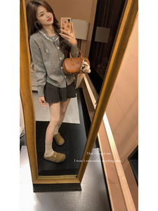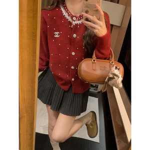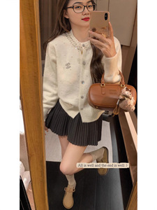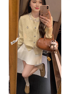 法式小香风重工镶钻钉珠圆领针织开衫女秋冬新款软糯针织毛衣外套