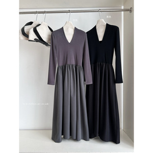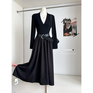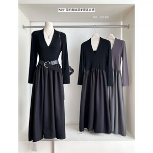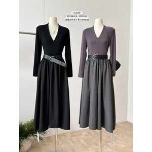 秋上新!韩系简约V领拼接松紧腰连衣裙配腰带时尚气质百搭长裙女
