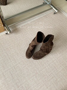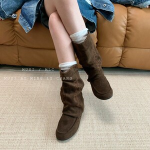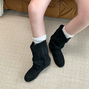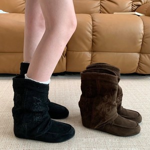 内增高裤管靴套筒中筒靴女2025秋冬新款度假雕花绒面西部牛仔靴女