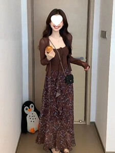 秋季2025复古小香风新款咖色三件套长袖开衫吊带上衣碎花半身裙女