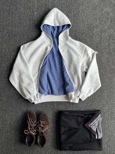 灰色美式开衫连帽卫衣男秋季cleanfit高级感miu系格纹双面穿外套