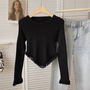 秋冬打底修身显瘦网红短款ins纯欲风流苏不规则长袖t恤女上衣