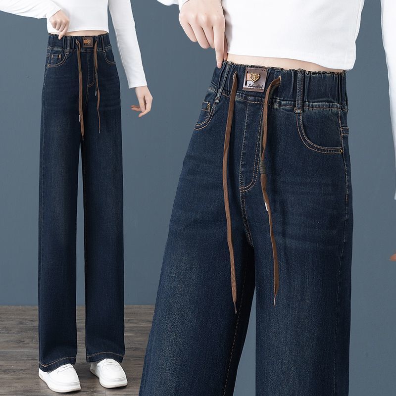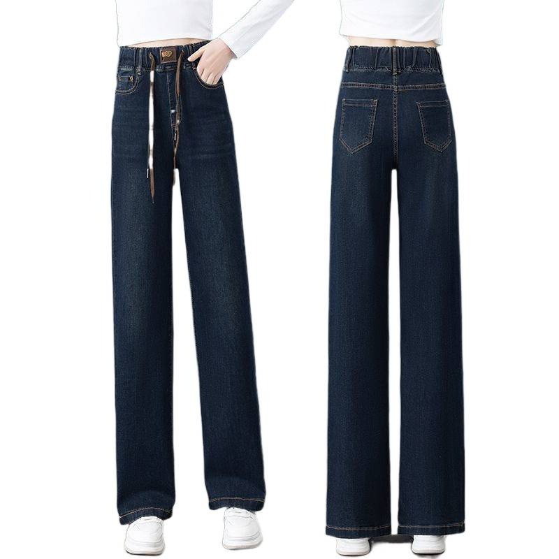 松紧腰牛仔裤女裤子春秋季新款高腰宽松直筒长裤窄版阔腿裤子