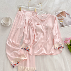 新中式国风真丝睡衣女春秋款长短袖桑蚕丝家居服套装带胸垫夏