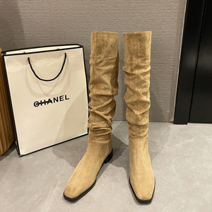 复古褶皱高筒长靴女2025年新款绒面尖头不过膝堆堆靴增高女骑士靴