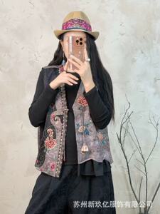 2025秋季新款民族风复古缎面马甲女文艺时尚刺绣缎面提花宽松背心