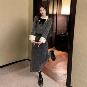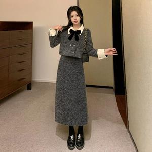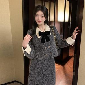 2025新款秋冬季韩系穿搭高级感小香风蝴蝶结呢子外套呢子裙两件套