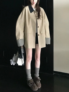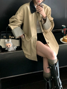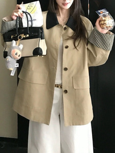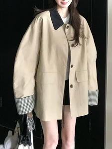 高智巴恩风 卡其色风衣撞色格纹拼接短款宽松外套女秋
