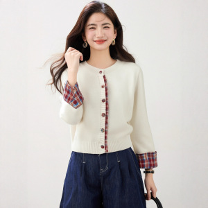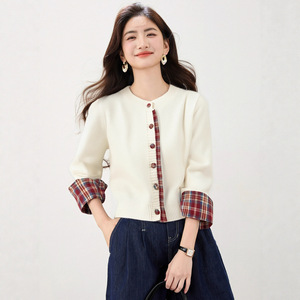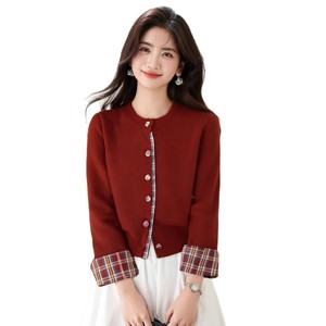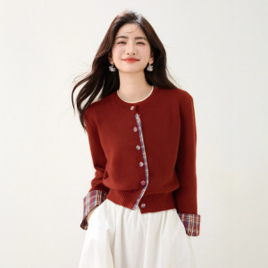 小香风红色开衫毛衣女2025秋冬小个子圆领拼接格子长袖短款针织衫