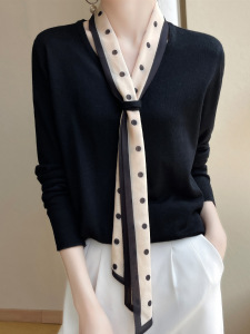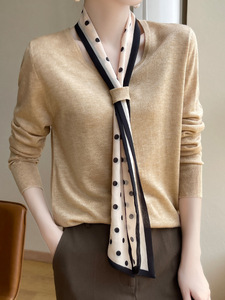 25早秋新款V领精纺羊毛衫带丝巾女知性优雅针织薄款毛衣宽松打底