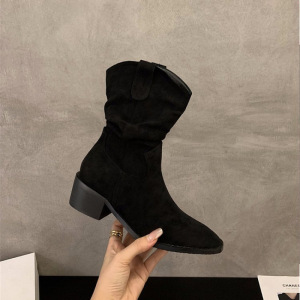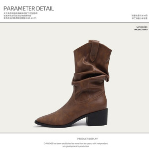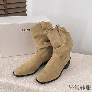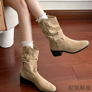 绒面西部牛仔靴女复古中筒尖头堆堆靴2025秋冬新款美拉德马丁靴女