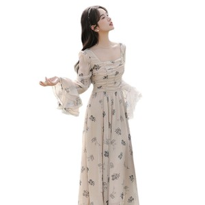 法式复古水墨印花褶皱方领连衣裙女收腰显瘦双层喇叭袖大摆长裙