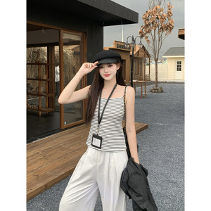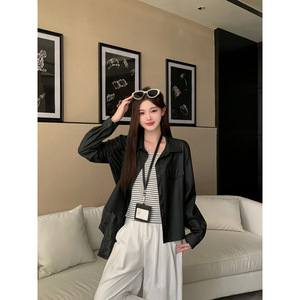 2025秋装新款胖mm大码女时尚条纹吊带机车皮衣外套两件套