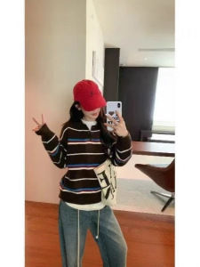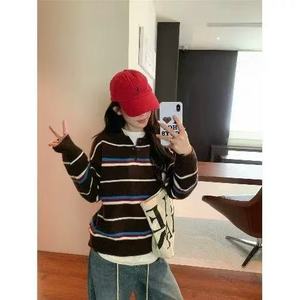 学院风简约POLO领条纹针织衫女2025秋冬新款韩版宽松显瘦减龄毛衣