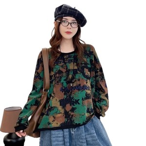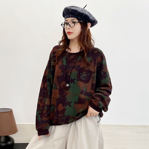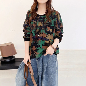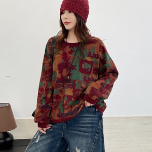 下摆抽绳印花卫衣女 2025秋新款复古文艺宽松圆领套头上衣 6801