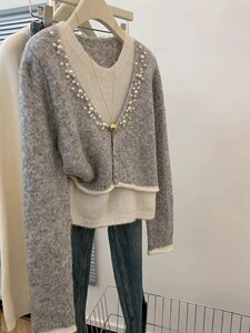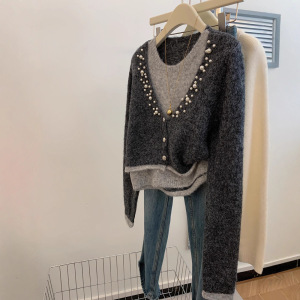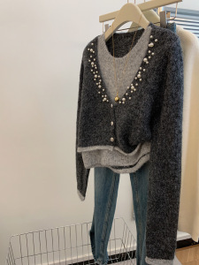 灰色叠穿假两件上衣女套头气质针织衫毛衣慵懒风设计感小众外套潮