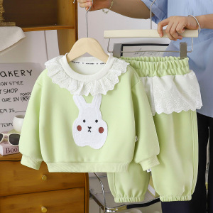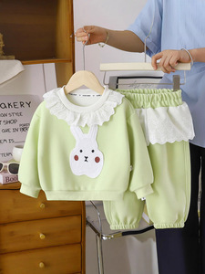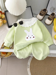 2025新款秋季宝宝卫衣薄荷绿套装蕾丝花边立体装饰兔休闲单色卫衣