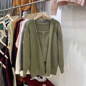 秋季韩系慵懒风麻花针织背心+v领宽松简约纯色开衫外套两件套装女