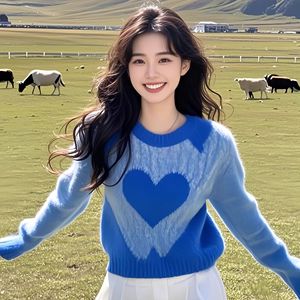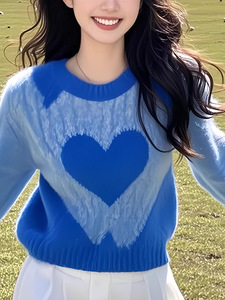 克莱因蓝爱心印花撞色毛衣针织衫女2025早秋季新款多巴胺漂亮上衣