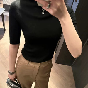 早秋新款精纺羊毛女半高领套头打底衫修身显瘦气质薄款五分袖内搭