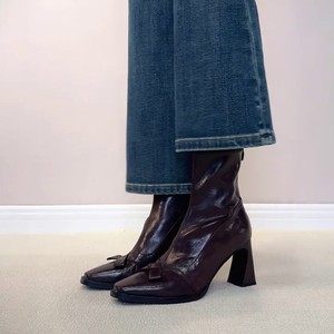 软皮版~复古蝴蝶结高跟靴小方头气质粗跟短靴后拉链弹力瘦瘦靴女