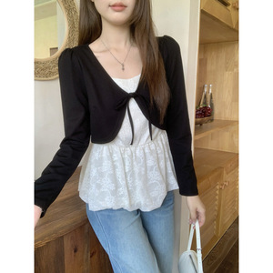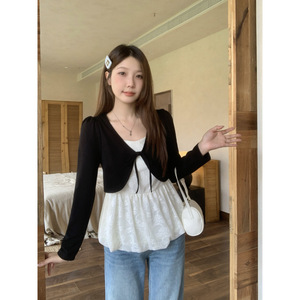 2025秋季新款胖mm法式假两件蕾丝拼接长袖T恤设计感气质拼色上衣
