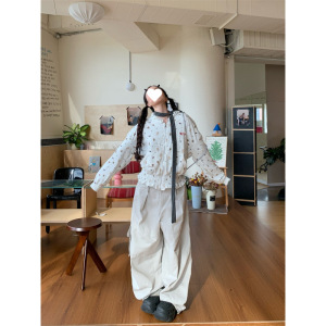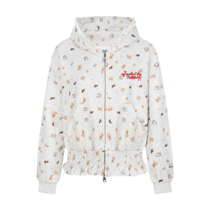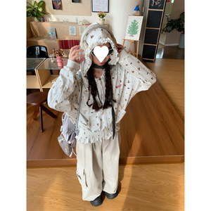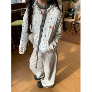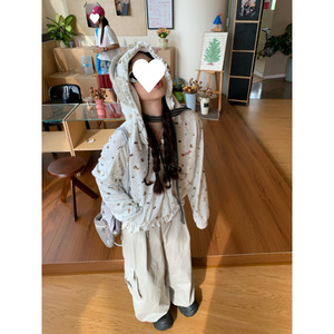原版做工 美式复古满印褶皱连帽卫衣女秋季慵懒风短款宽松外套