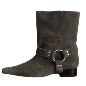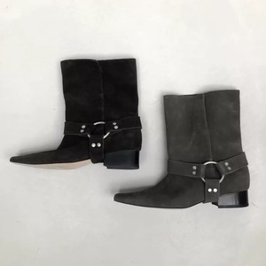 羊皮版~复古小众方头皮带扣翻折两穿中筒靴女粗跟西部牛仔靴短靴