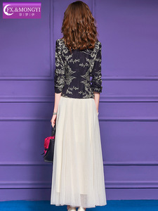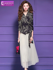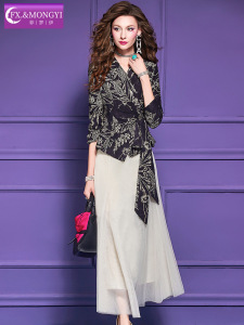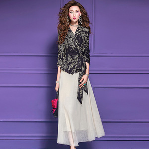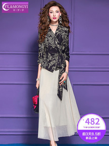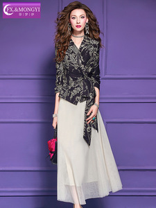 菲梦伊早秋穿搭一整套女国风设计感印花收腰黑色上衣半身裙两件套