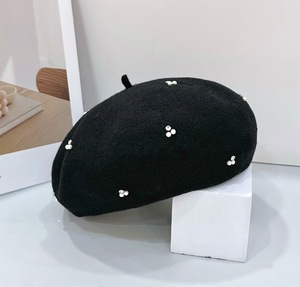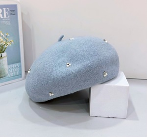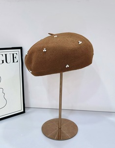 批发25年早秋新款日系银丝水钻珠花贝雷帽子澳洲羊毛优雅针织帽潮