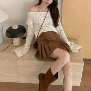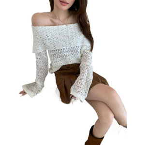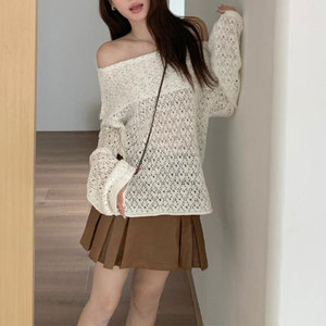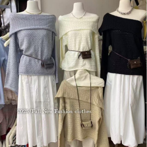 十三行2025早秋新款韩版慵懒风气质百搭一字肩镂空针织衫上衣女