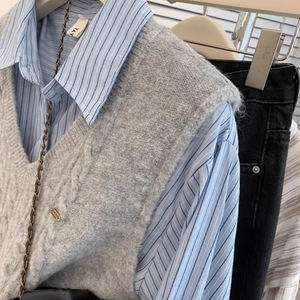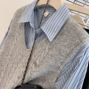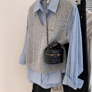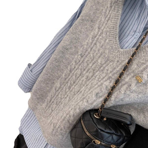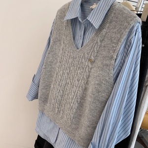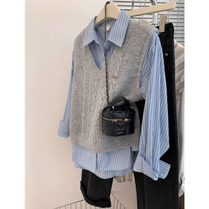 韩系宽松灰色v领麻花毛衣马甲女秋冬季无袖坎肩叠穿外搭针织背心