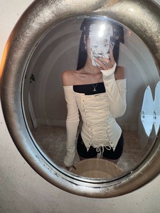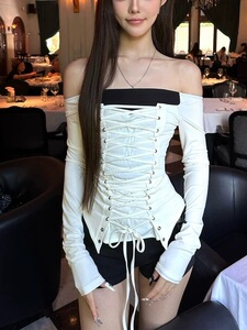 黑有染俘获心动 拼色绑绳长袖T恤设计感假两件针织上衣