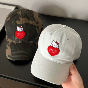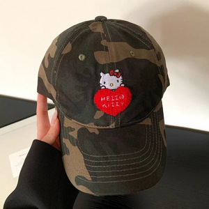 可爱刺绣爱心迷彩kitty猫棒球帽女软顶大头围户外韩国街头鸭舌帽