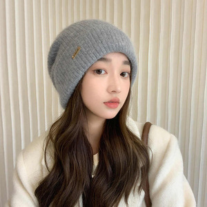 百搭文艺复古金属标毛线帽秋冬新款大头围套头帽户外防风保暖帽韩