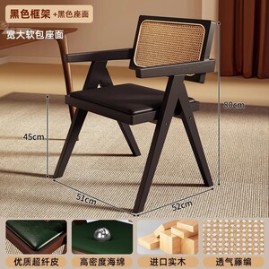 黑色实木框架+藤编靠背+黑皮坐垫