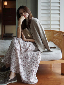 高端100亚麻印花宽松上衣A字大摆半身裙时尚套装两件套女春秋新款